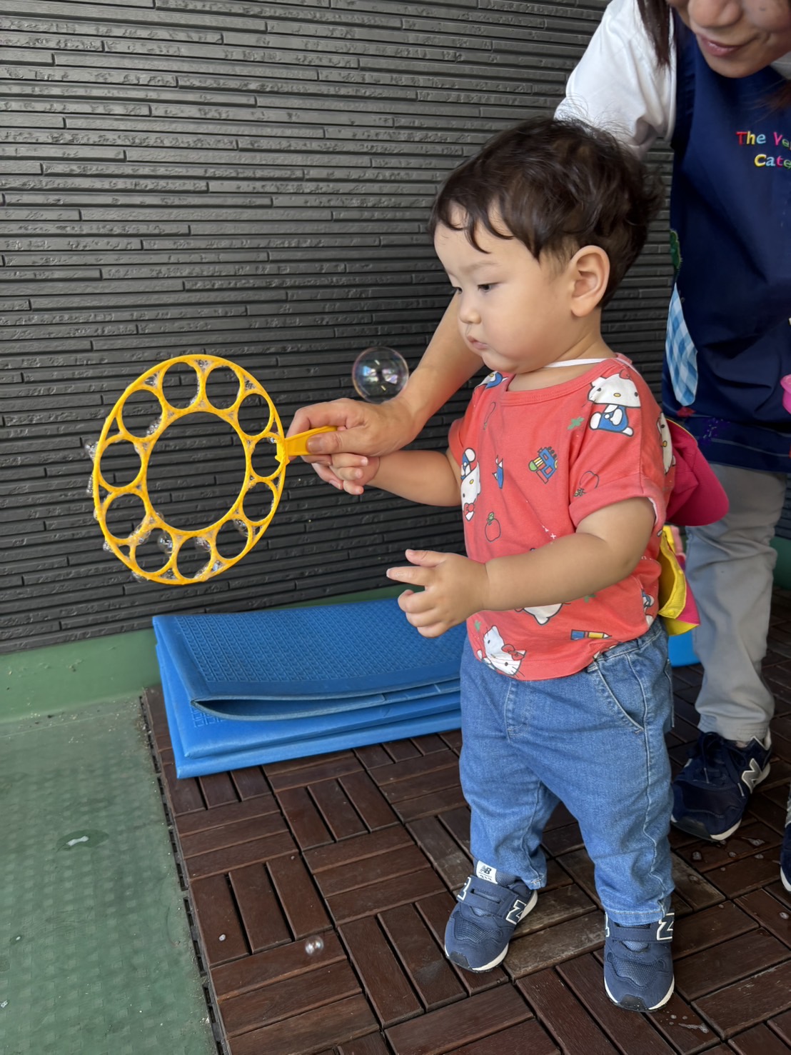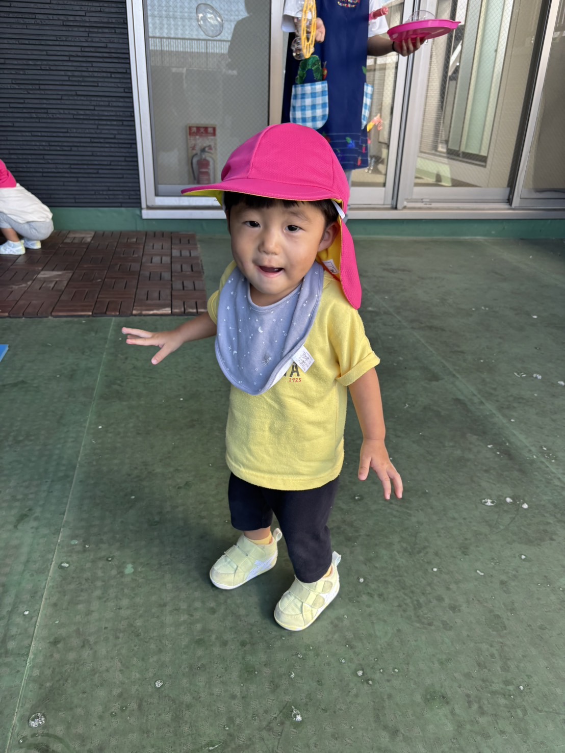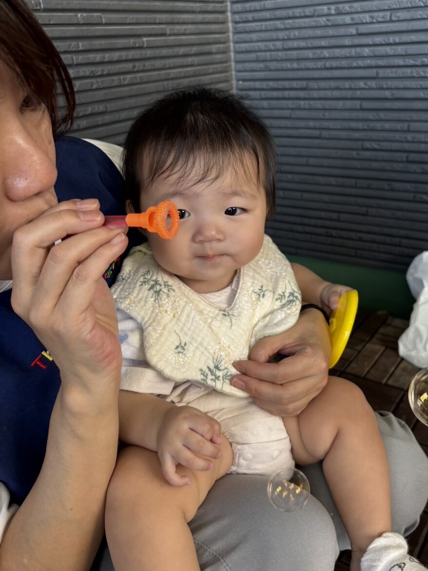0歳児さんはテラスでしゃぼん玉で遊びました。