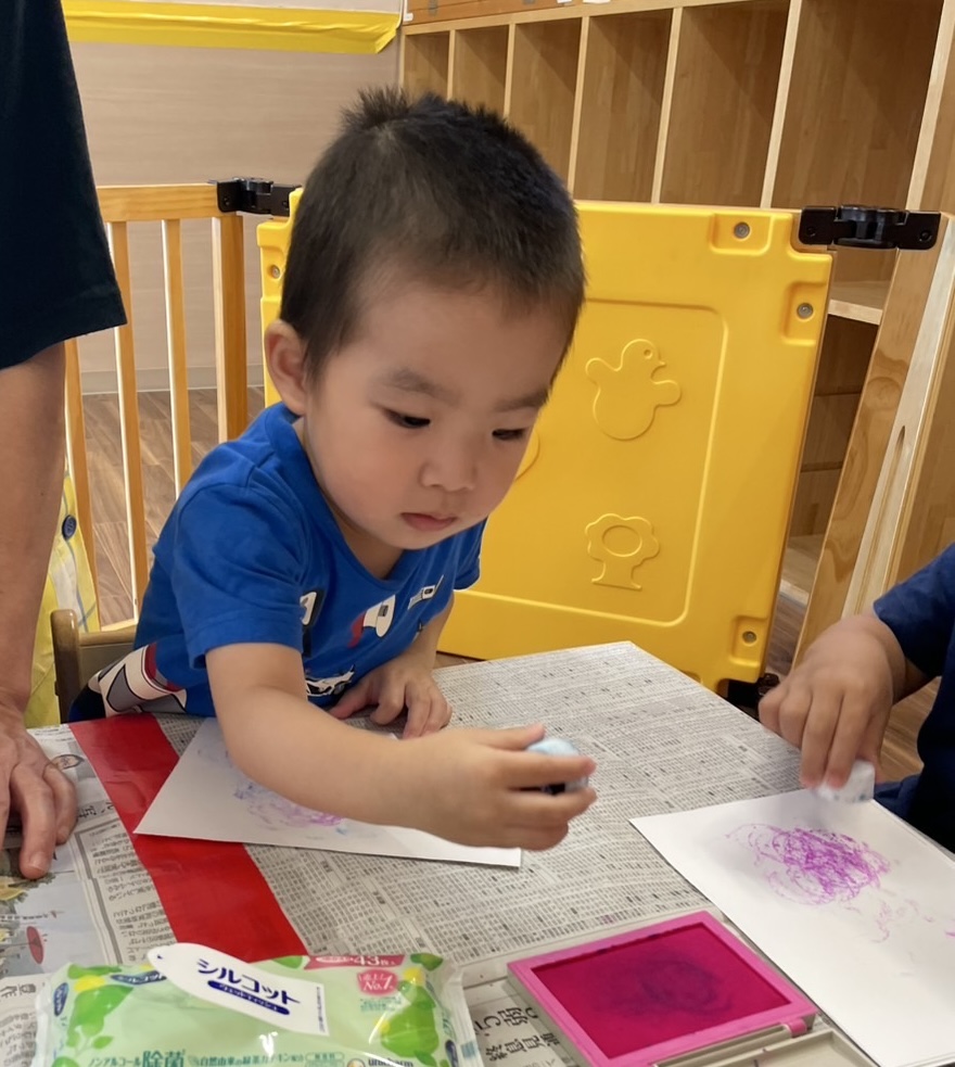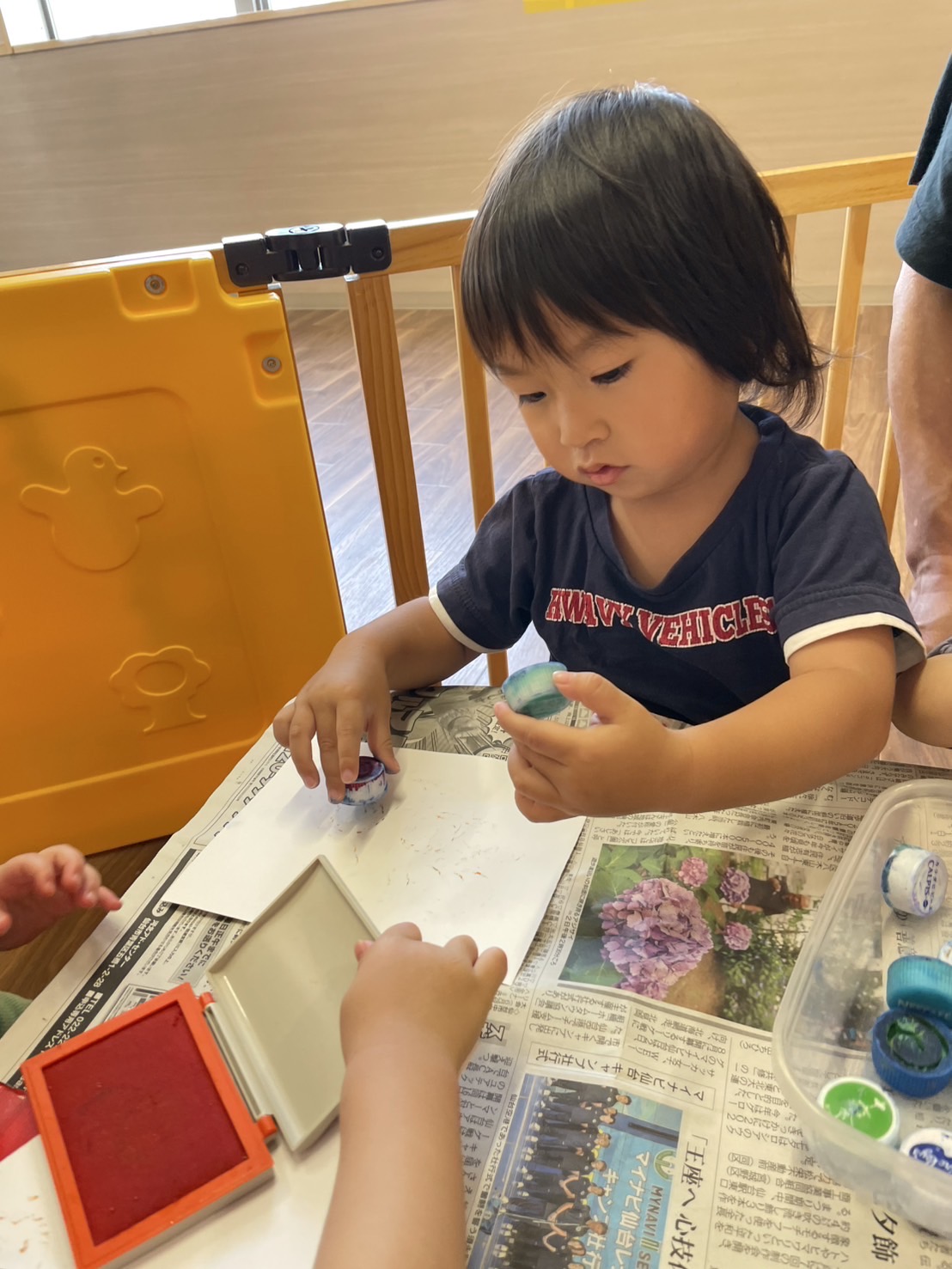 1歳児さん、2歳児さんはペットボトルのキャップでスタンプを押して遊びました😆✨