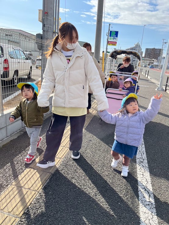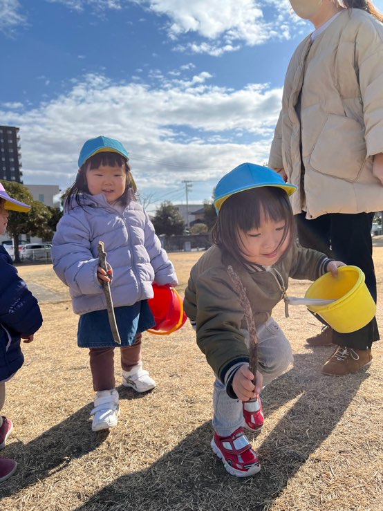 今日はポカポカ良いお天気だったので1,2歳児さんは公園に行きました☀️