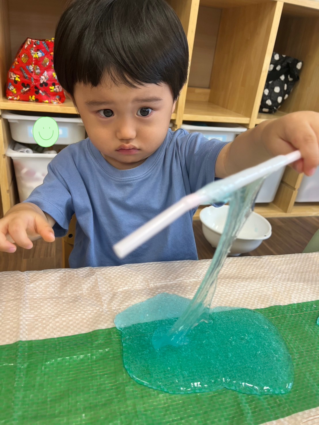 ストローをつけたら、スライムがビヨーンと伸びて