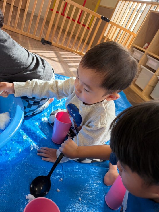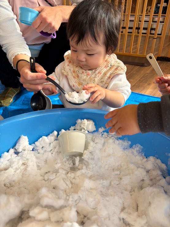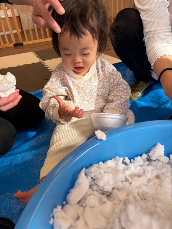 0歳児さんは、お部屋で雪遊びをしました❄️